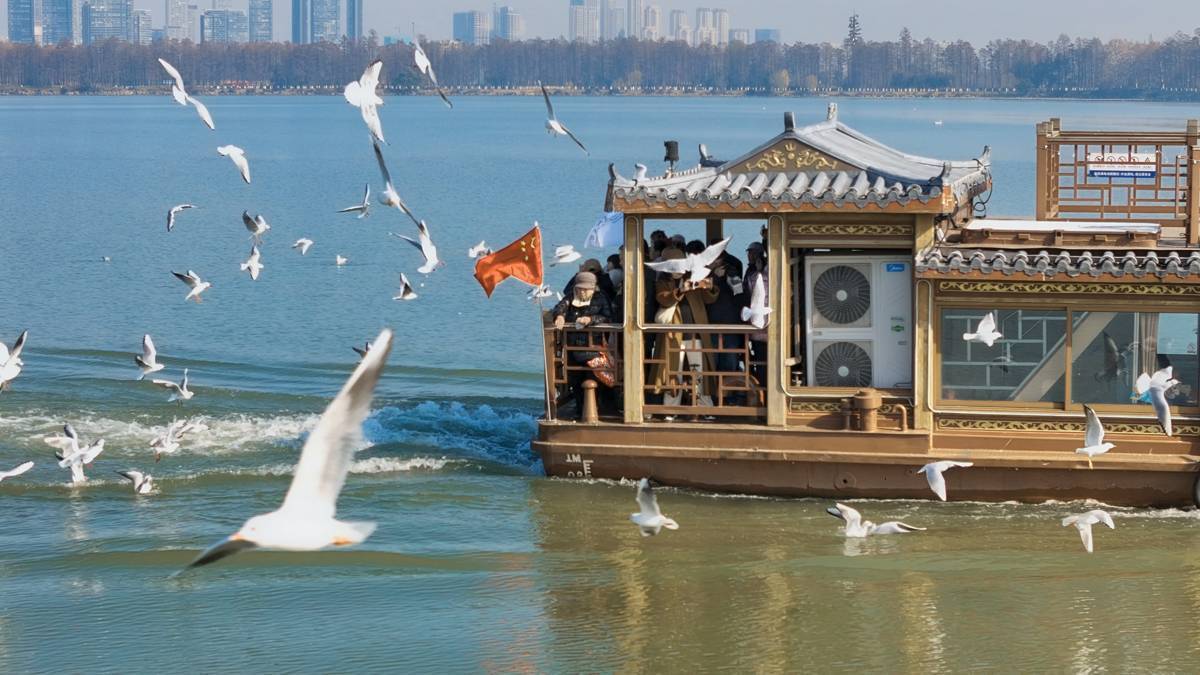 据武汉观鸟协会观测,今年在东湖越冬的红嘴鸥数量接近500只,达到近年峰值。每年11月,这群来自西伯利亚的“白色精灵”如约飞抵东湖,在碧波荡漾的湖面上栖息、嬉戏。优良的生态环境、充足的食源,让它们在东湖安心度过整个冬天。楚风园码头、磨山北码头、碧潭观鱼等热门点位,处处可见“鸥影翩翩逐碧波”的美景,“鸥随船动”的画面在社交平台持续刷屏,让“冬季到武汉看鸥”成为新的城市文旅IP。