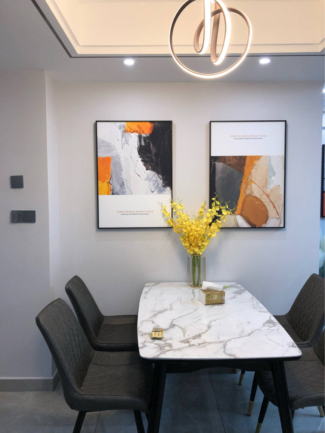 入门右手边是餐厅空间,充分利用了玄关到客厅之间的空间,作为餐厅很实用。餐桌椅靠墙摆放不占过道空间,利用墙面挂装饰画更美观时尚。