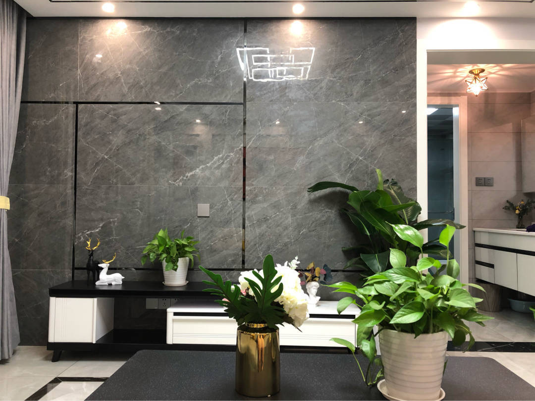 电视背景墙直接用灰色瓷砖上墙做简单装饰,再用银黑色装饰条做简单分割,让整个背景墙不那么单调,现在就差电视机了。