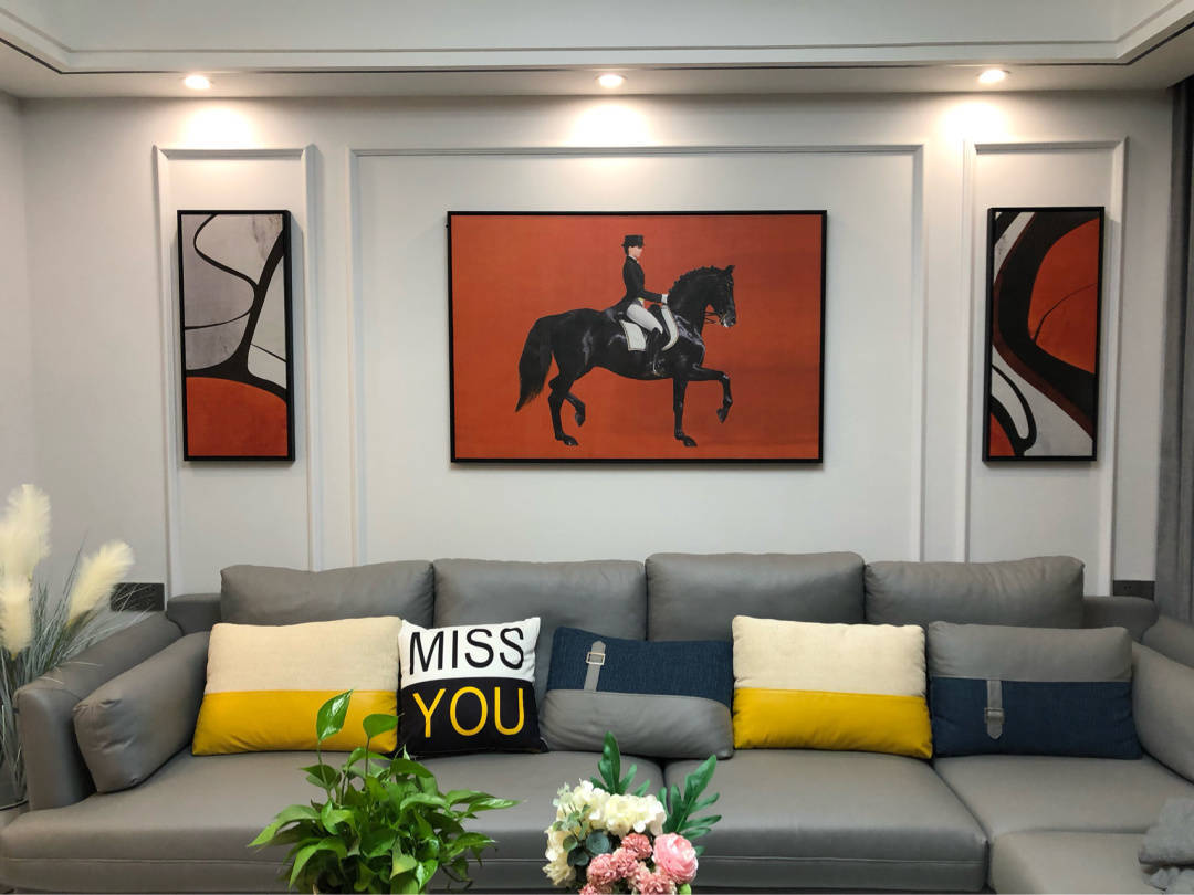 客厅的沙发背景墙做了简单造型装饰,石膏材料打造的造型整体感颇佳,搭配装饰画,灰色沙发与之相得益彰,整个沙发区时尚感与实用性兼备,毕竟沙发空间宽敞,色彩搭配也十分舒适。